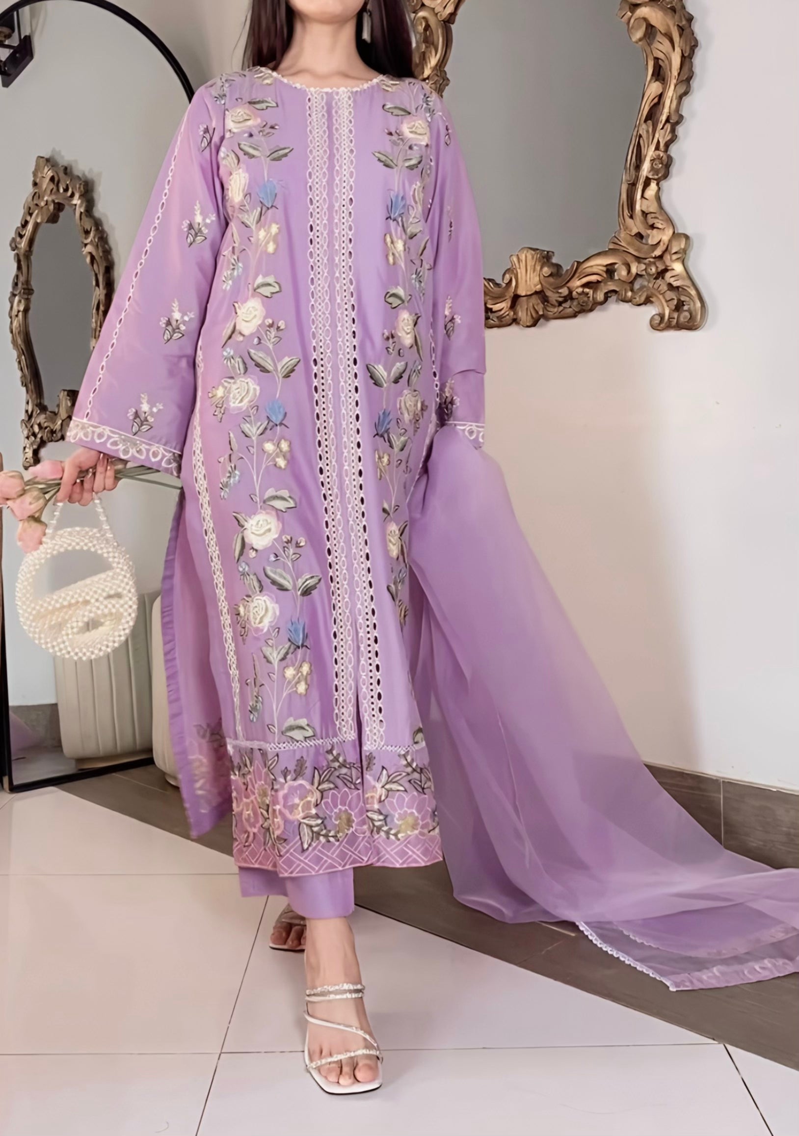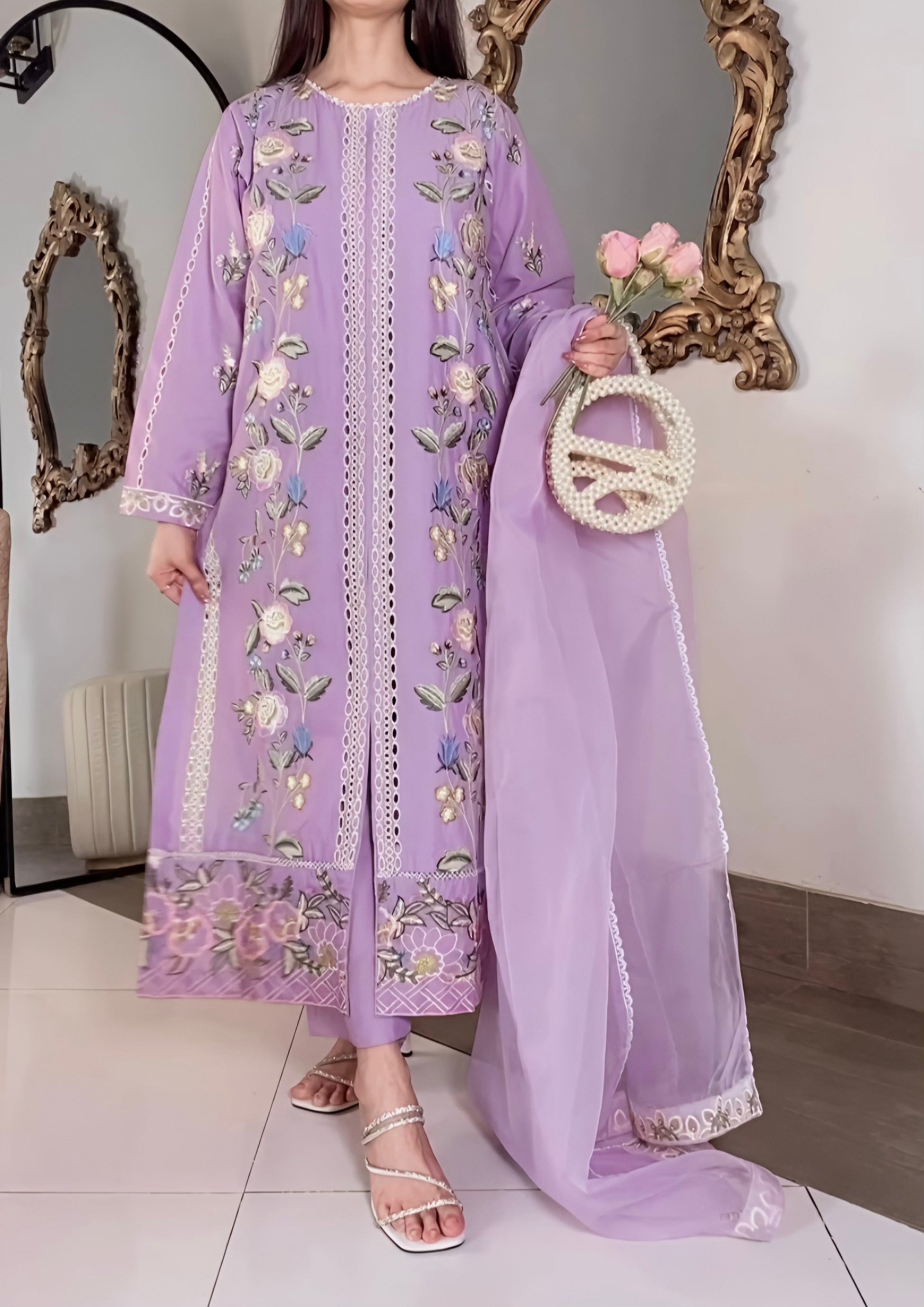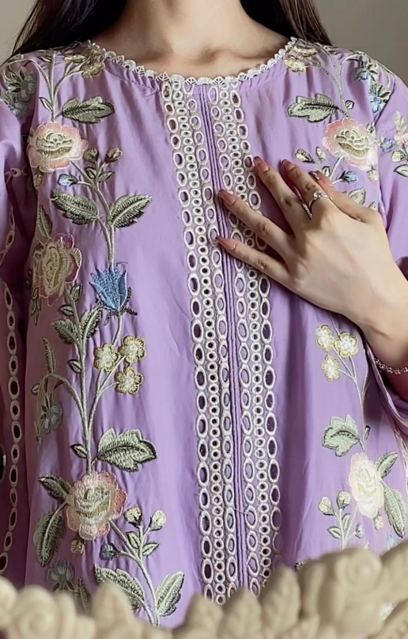 This is a 3-piece embroidered lawn dress in mustard. It comes with an organza dupatta that has light embroidery on both sides. The long shirt has chikankari-inspired embroidery in the middle panel with a cut design and pretty floral threadwork all over. Paired with a long plain trouser, this outfit is minimal, rustic, and graceful for any occasion.